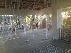 吹上町の戦没者1219名を祀った神社に、吹上に住んでいる人々から集めた、シーツやカーテン、ワイシャツなどの白い布にハサミを入れ、この場で編みこんでいった